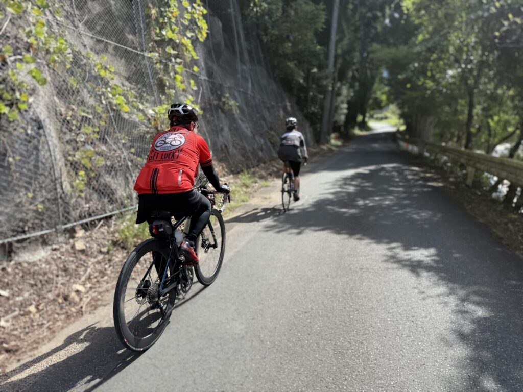 一人はケイデンス低くく重めのギアでしっかり踏めるポイント確認と、それでも膝頭の四頭筋を使わないペダリングを意識する